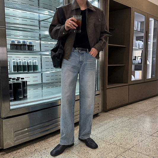 South Korea light ripe wind series bright line leather coat short style quality loose drop shoulder sleeve PU leather coat INS trend motorcycle men